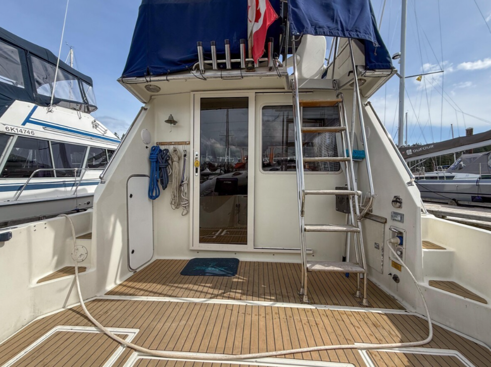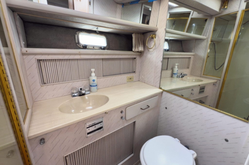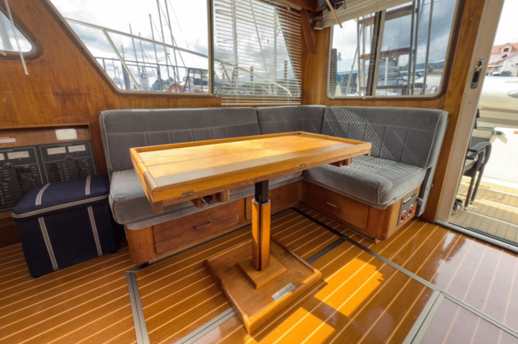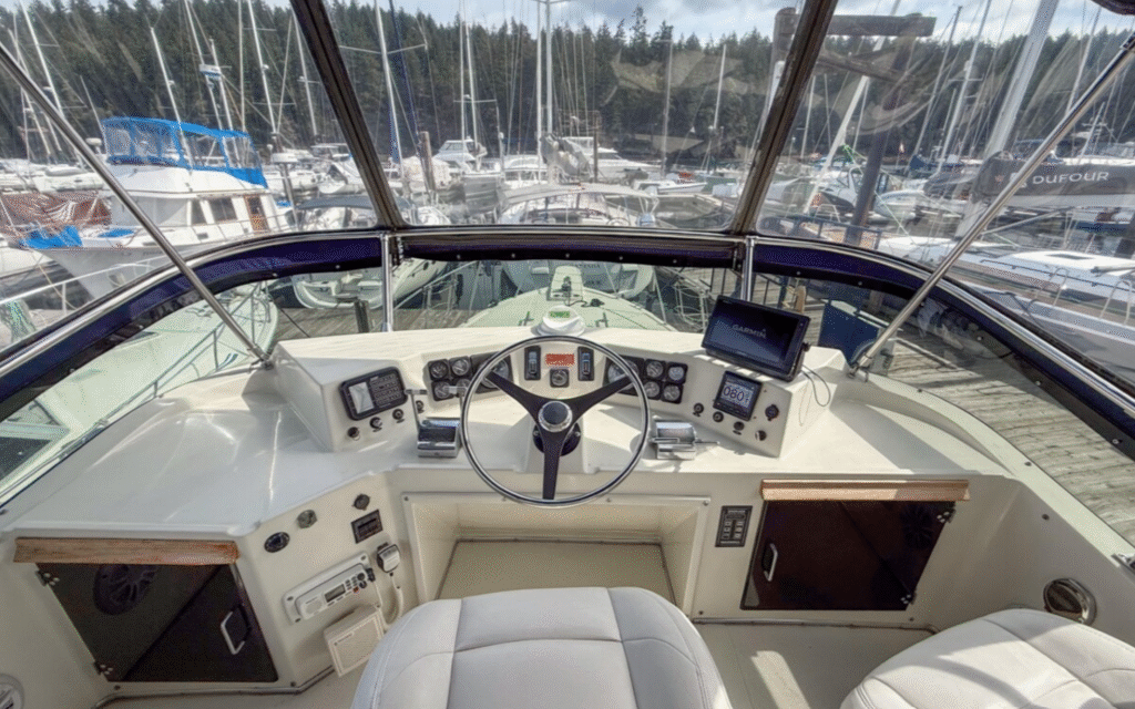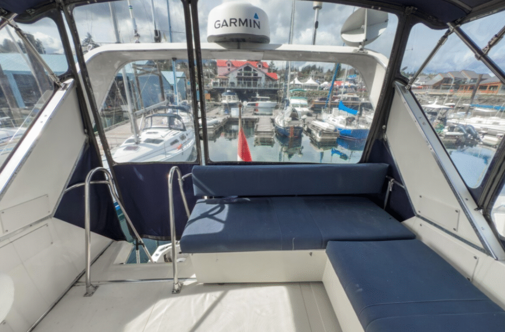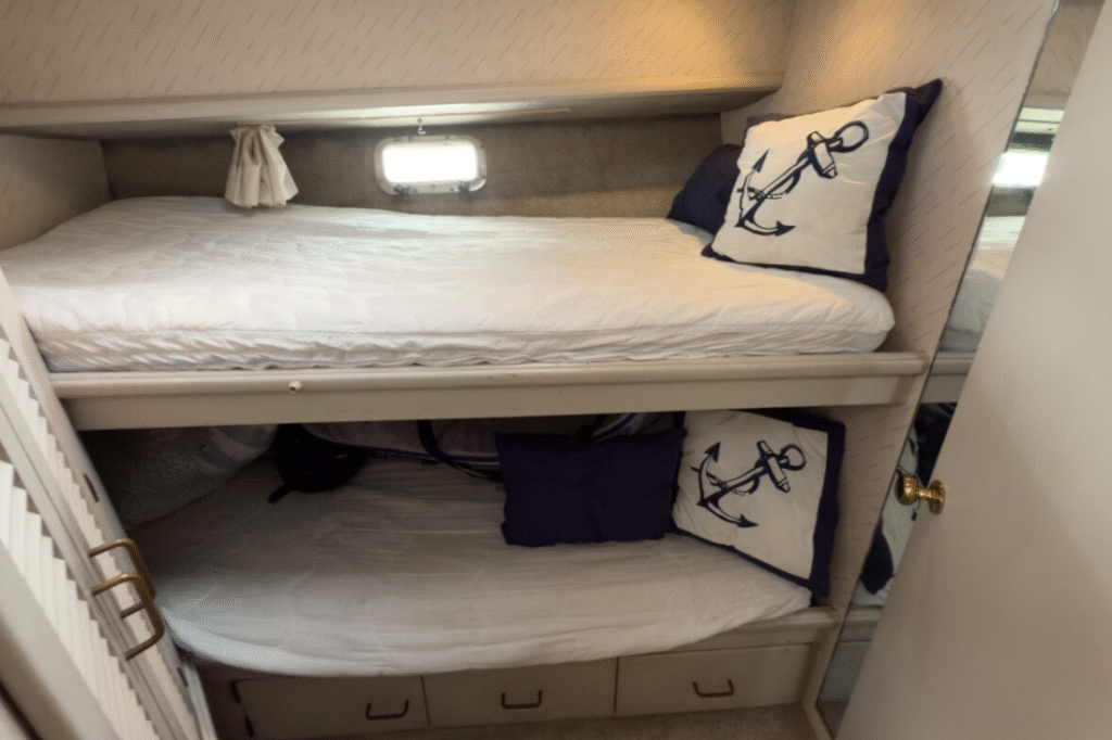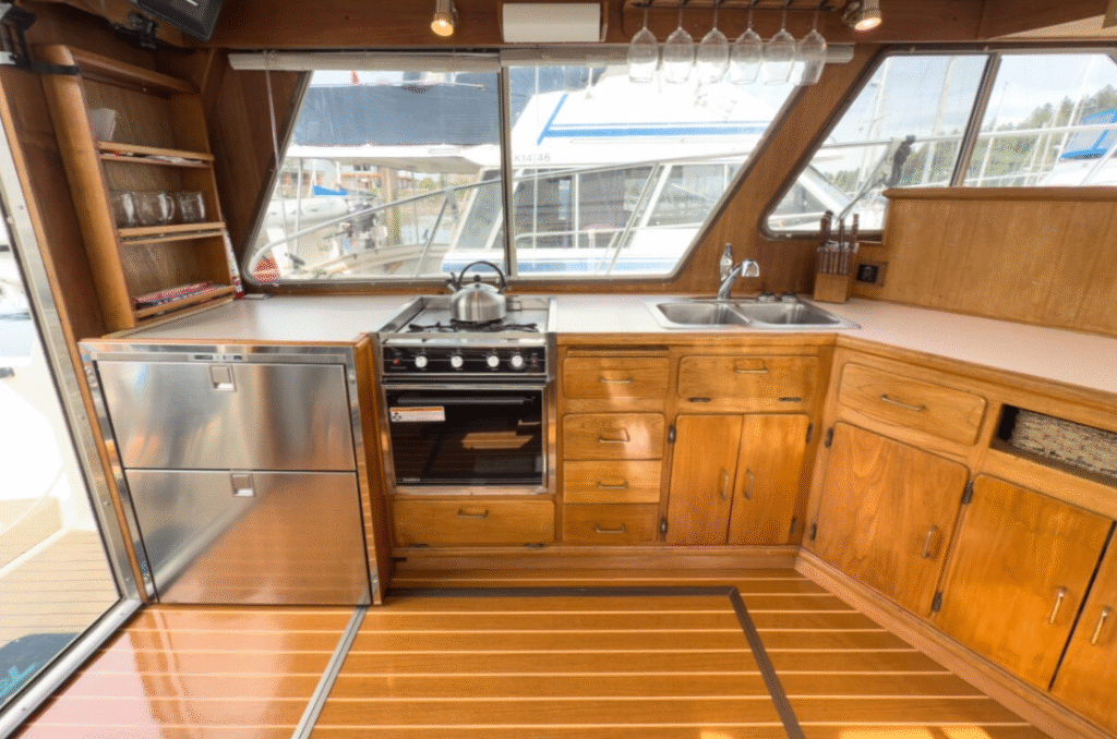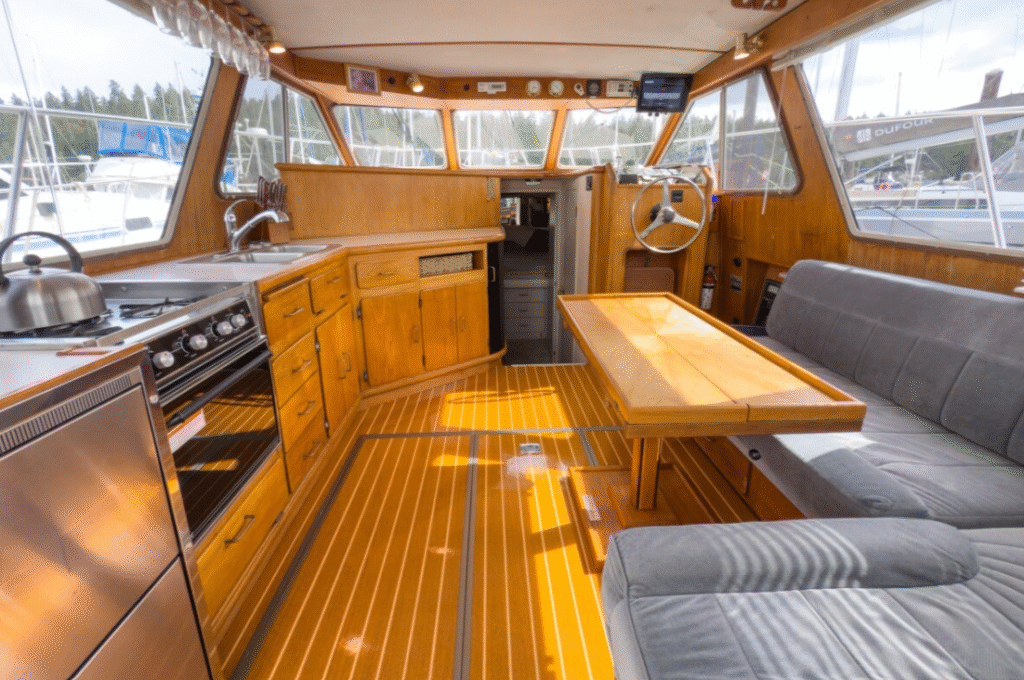 The layout of the Tollycraft 34′ is thoughtfully designed for comfort and functionality. It accommodates four in two private staterooms: a master stateroom with a centreline island berth, hanging locker, and drawers, plus a skylight hatch; and a guest stateroom with upper and lower bunks. The head features a Techma freshwater vacu-flush toilet, a molded sink, and a separate walk-in shower. The galley is well-equipped with a stainless double sink, 3-burner electric stove, and new front loading refrigeration and freezer. The salon offers an inviting L-shaped settee with teak table, ESPAR hydronic heating, and warm teak accents throughout.