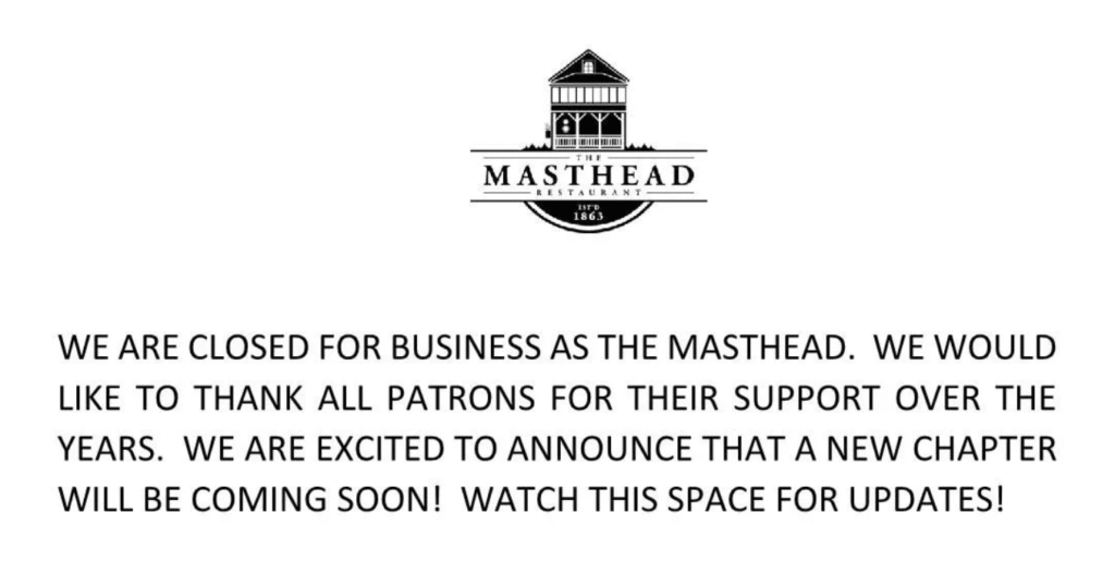The end of an era… After decades of hosting your milestones and celebrations, The Masthead Restaurant has closed its doors.