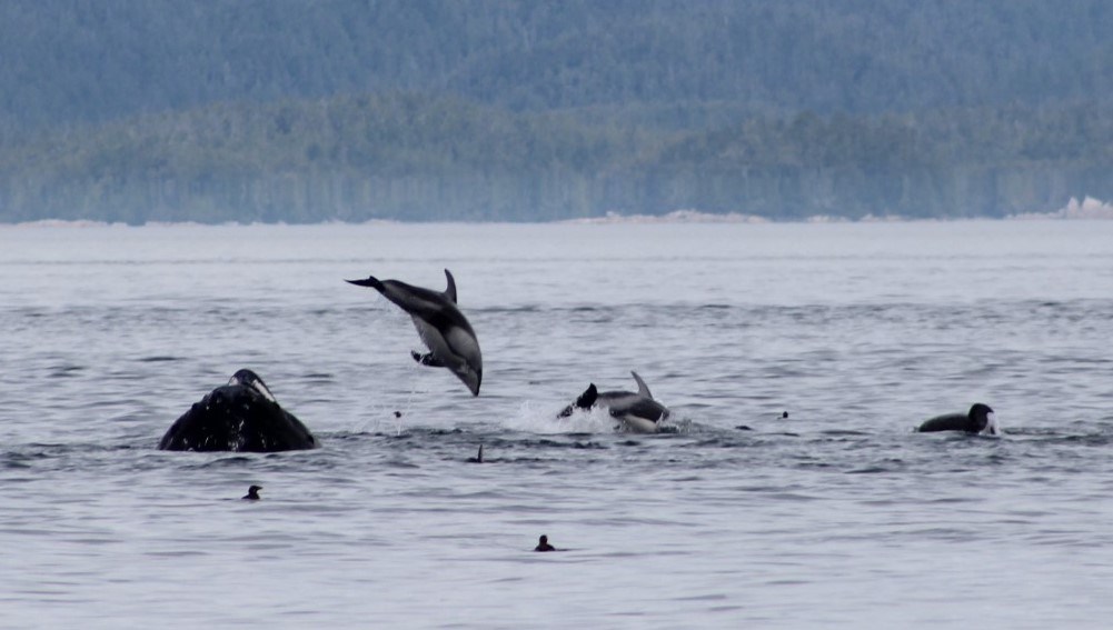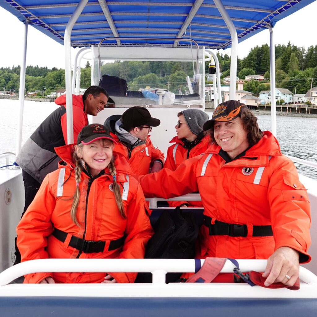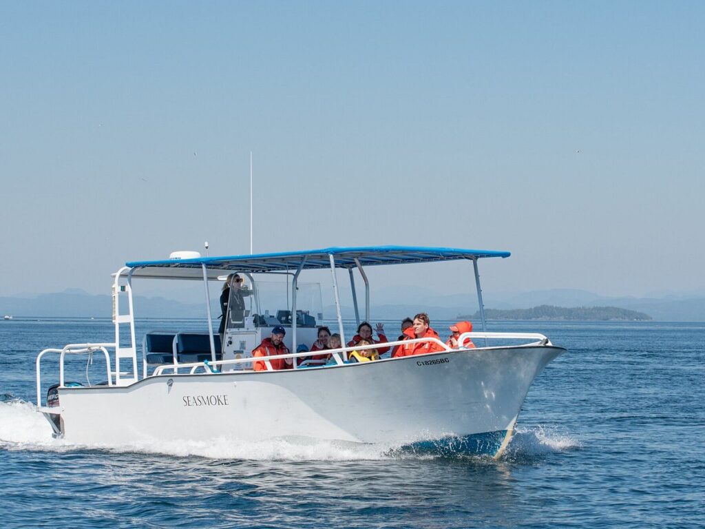 ‘Seasmoke’ is a 32’ fibreglass boat with twin 175 HP Suzuki engines. With capacity for 12 guests (though we usually cap it at 11), there’s plenty of space to spread out and enjoy the view. Unlike most small whale watching vessels, when we’re stopped to view wildlife, guests are able to stand up and move around. The canopy provides some cover from sun and rain, while preserving the 360-degree view. We’re equipped with GPS navigation, radar, VHS radio, and an emergency beacon. A fully enclosed bathroom means you can concentrate on making memories and not worry about that second cup of coffee!