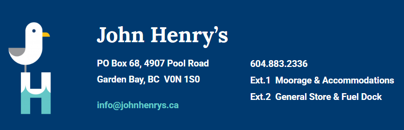 There’s been a General Store in Garden Bay on Pool Road since the 1940’s. Originally called Lloyd’s, it’s been John Henry’s for many, many years.