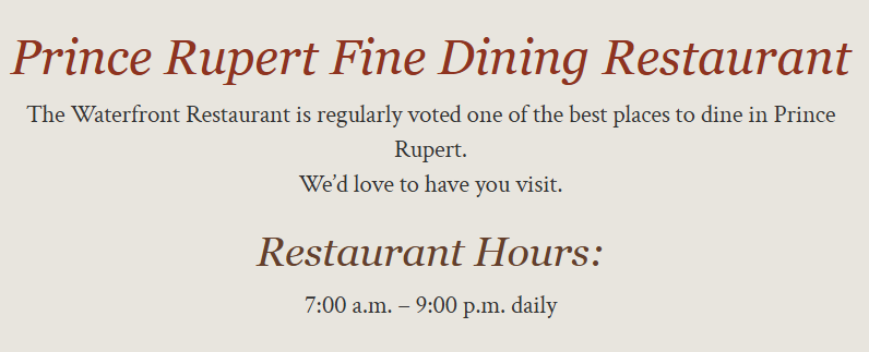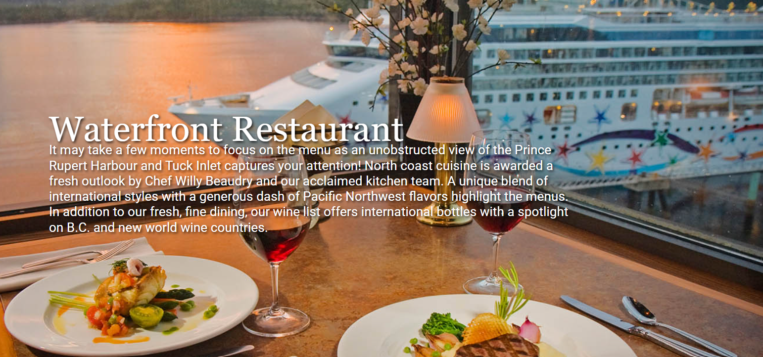 Our Prince Rupert hotel offers a variety of guest amenities with something to please every traveler. For guests who consider great cuisine a highlight of their trip, we invite you to visit our Waterfront Restaurant or our award-winning lounge.